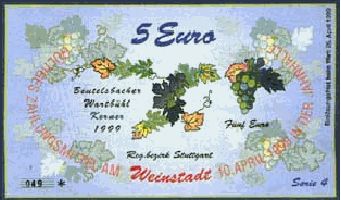 Weinstadt Series - Set 4Set 4 was printed for the 7th collector's fair in Weinstadt. It consists of seven notes with denominations in Mark (from 50 Pfennig to 10 German Mark) and five EURO-notes (from 50 Cent to 5 EURO). Several notes of this set 4 were reissued with an overprint on Jan, 16th, 2000. The reason has been another big party in the Jahnhalle and the fact, that there still was no cash in EURO. ![]() ![]()